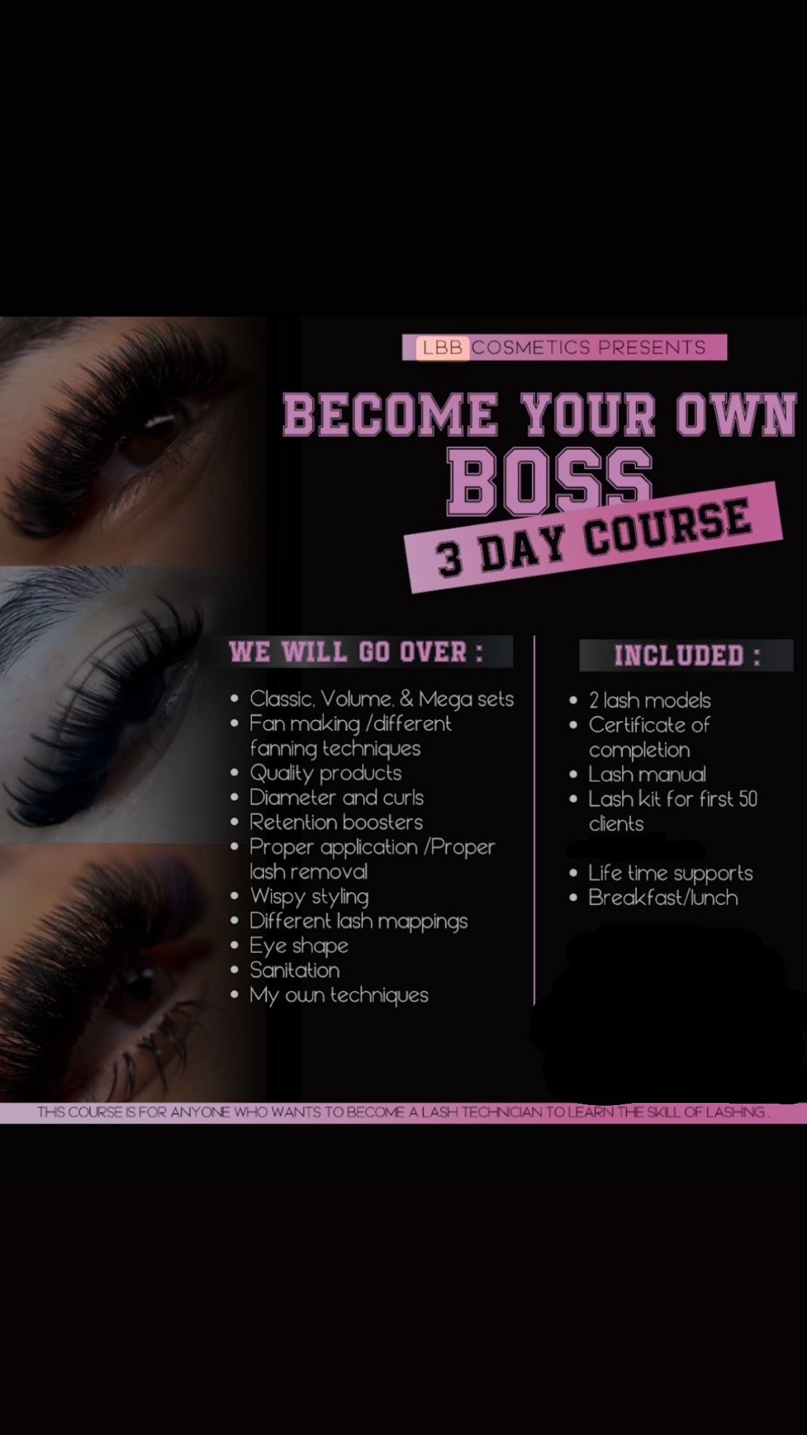 The first day we will be going over everything about lashing 4/5 hours